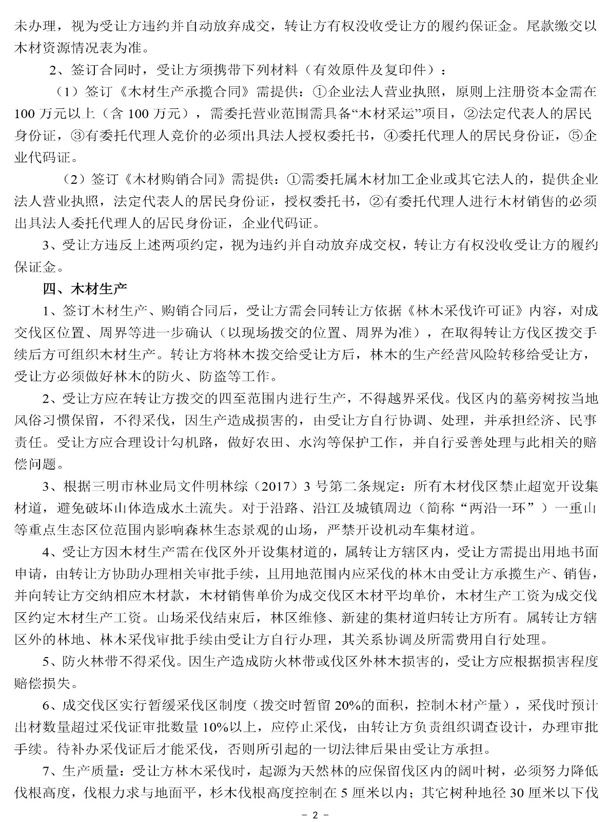 成交確認、價款支付及合同簽訂 | 1 .成交后的兩個工作日內受讓方以微信、郵箱等方式收到《成交通知書》掃描件或電話通知;若受讓方未及時收到成交通知書的,請主動與轉讓方聯系。 2.價款交納日期及方式:成交后,受讓方須于2022年2月16日17:00前將首期木材款(詳見木材資源情況一覽表)及每標生產風險保證金6.5萬元(含木材生產進度、質量保證金3萬元;銷售進度保證金1.5萬元;安全生產保證金2萬元)轉入轉讓方指定銀行賬戶,并與轉讓方簽訂《木材生產承攬合同》和《木材購銷合同》。尾款交付方式以木材資源情況一覽表為準。 轉讓方指定銀行賬戶如下: 戶名:福建金森林業股份有限公司 開戶銀行:福建將樂成功村鎮銀行股份有限公司 賬號:9031510010010000033058 3.受讓方不依據本公告的要求履約的,視為自動放棄受讓資格,其已交納的交易保證金不予退回,并對交易中心因此造成的損失承擔賠償責任,轉讓方有權將該標的重新組織競買交易。 | ||